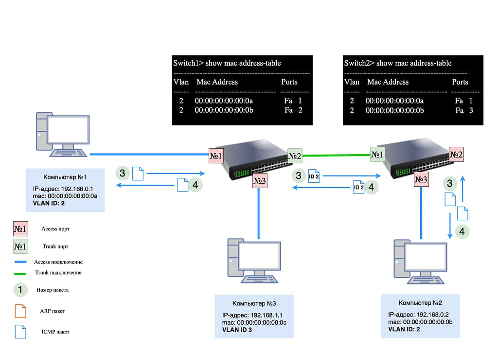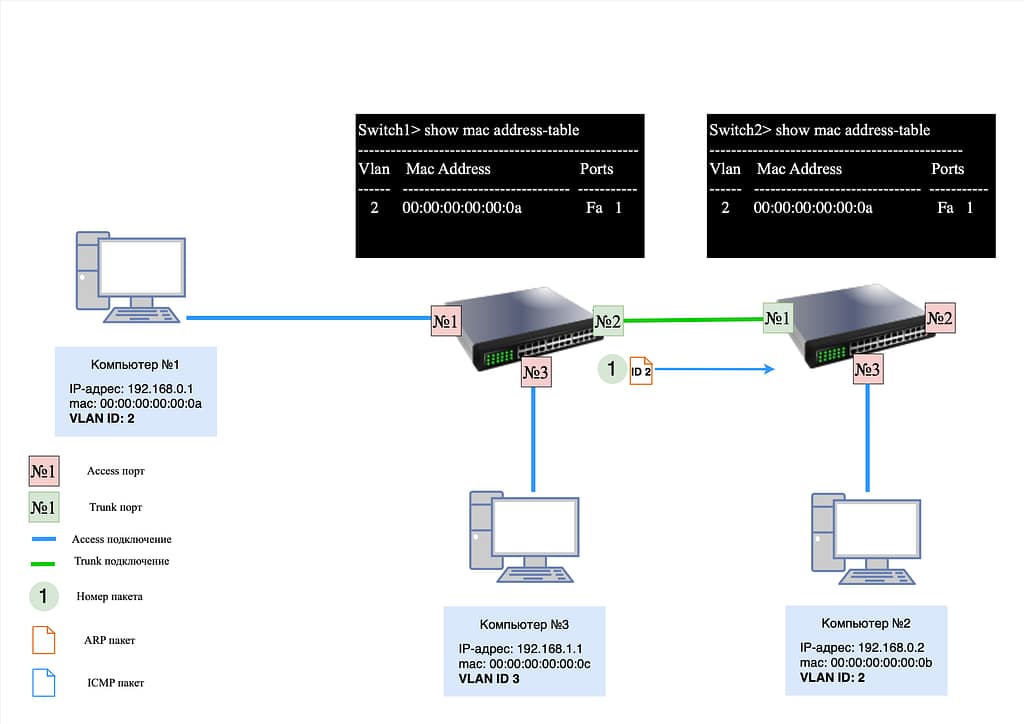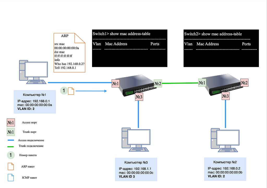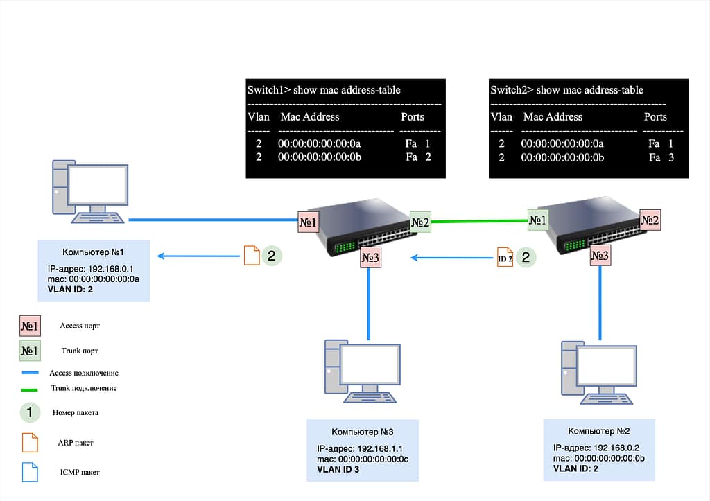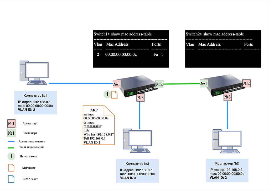 - поскольку MAC-адрес Компьютера №2 еще неизвестен, запрос отправляется на trunk-порт с добавленным VLAN ID 2.