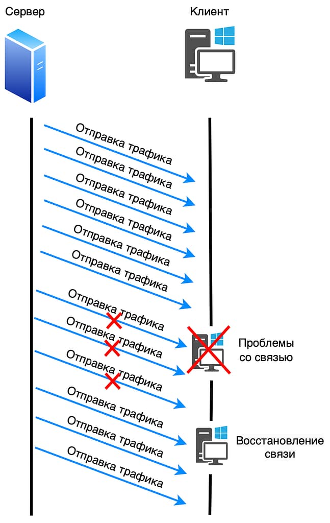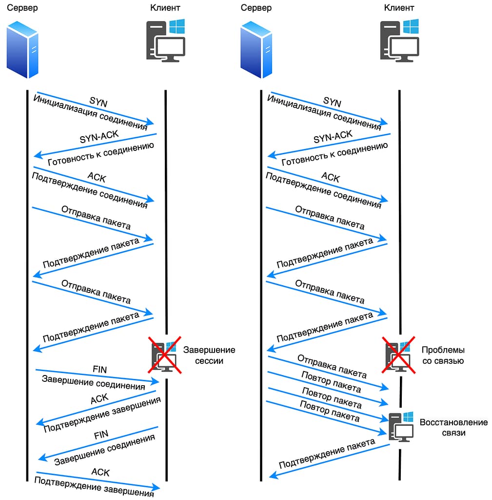 После установки соединения начинается передача полезных данных. TCP обеспечивает надежную передачу данных с помощью механизма подтверждений. Получатель данных подтверждает получение каждого сегмента, отправляя отправителю сообщение с порядковым номером следующего сегмента, который он ожидает получить. Если подтверждение не приходит в установленное время, сегмент передается заново. После нескольких неудачных попыток TCP может решить, что соединение потеряно, и завершить сессию.