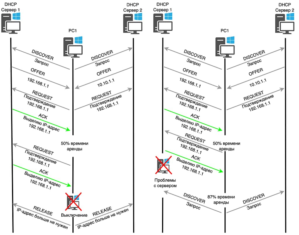 В одной сети может быть несколько DHCP-серверов. Если они получат широковещательный запрос, оба предложат свои IP-адреса. Устройство выберет один из предложенных IP-адресов и отправит DHCP REQUEST всем серверам, указав выбранный IP-адрес. В ответ на четвертое сообщение (DHCP ACK) отзовется только тот сервер, чей IP-адрес был выбран.