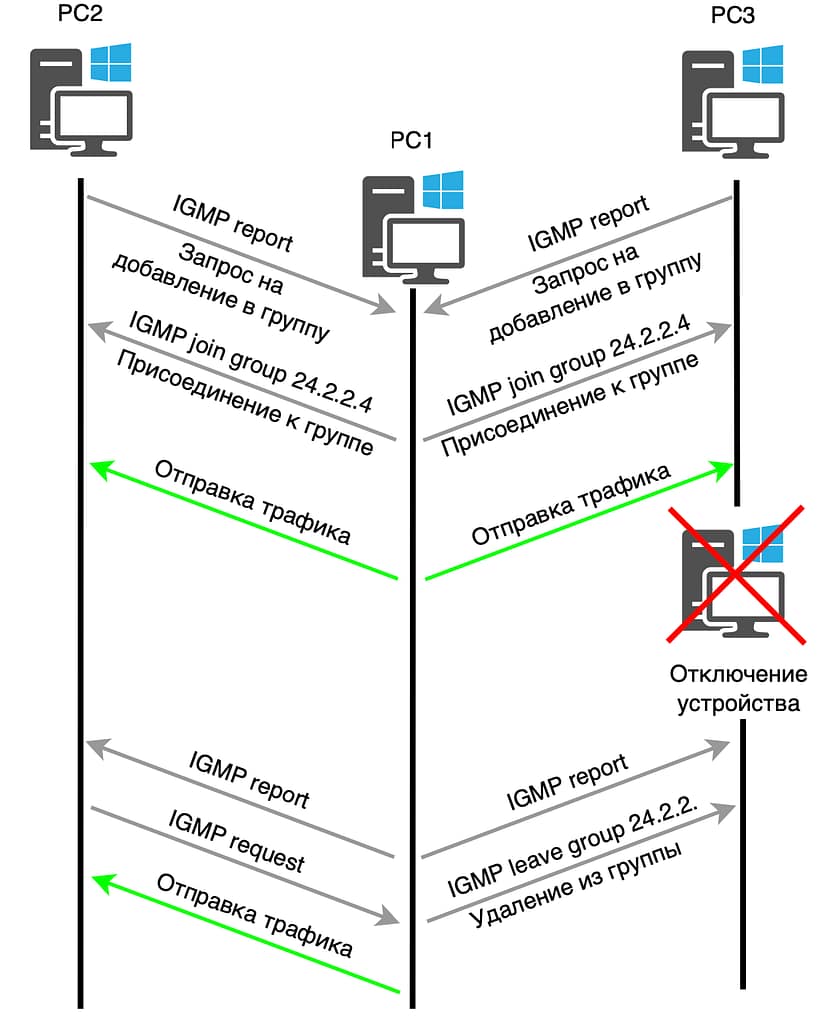 После получения запроса маршрутизатор регистрирует наличие клиента за соответствующим интерфейсом и заносит информацию о нём в свою таблицу. С этого момента маршрутизатор начинает пересылать мультикастовый трафик на соответствующее устройство. Когда клиент отключается, маршрутизатор отправляет запрос всем подключенным устройствам, и те, кто хочет продолжать получать трафик, отвечают. После получения ответов маршрутизатор обновляет свои таблицы и продолжает доставку трафика только тем, кто остался в группе. Если устройство вышло из группы, ему отправляется IGMP-пакет, сообщающий об этом.