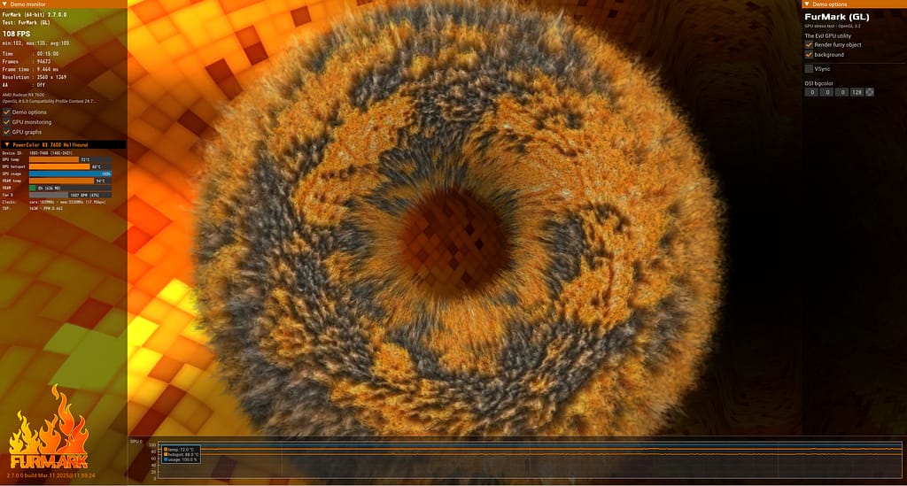 - FPS: Средний FPS составляет 108, что весьма впечатляет для стресс-теста с разрешением 2560 x 1369. Это указывает на высокий потенциал для игр и графически насыщенных приложений.
